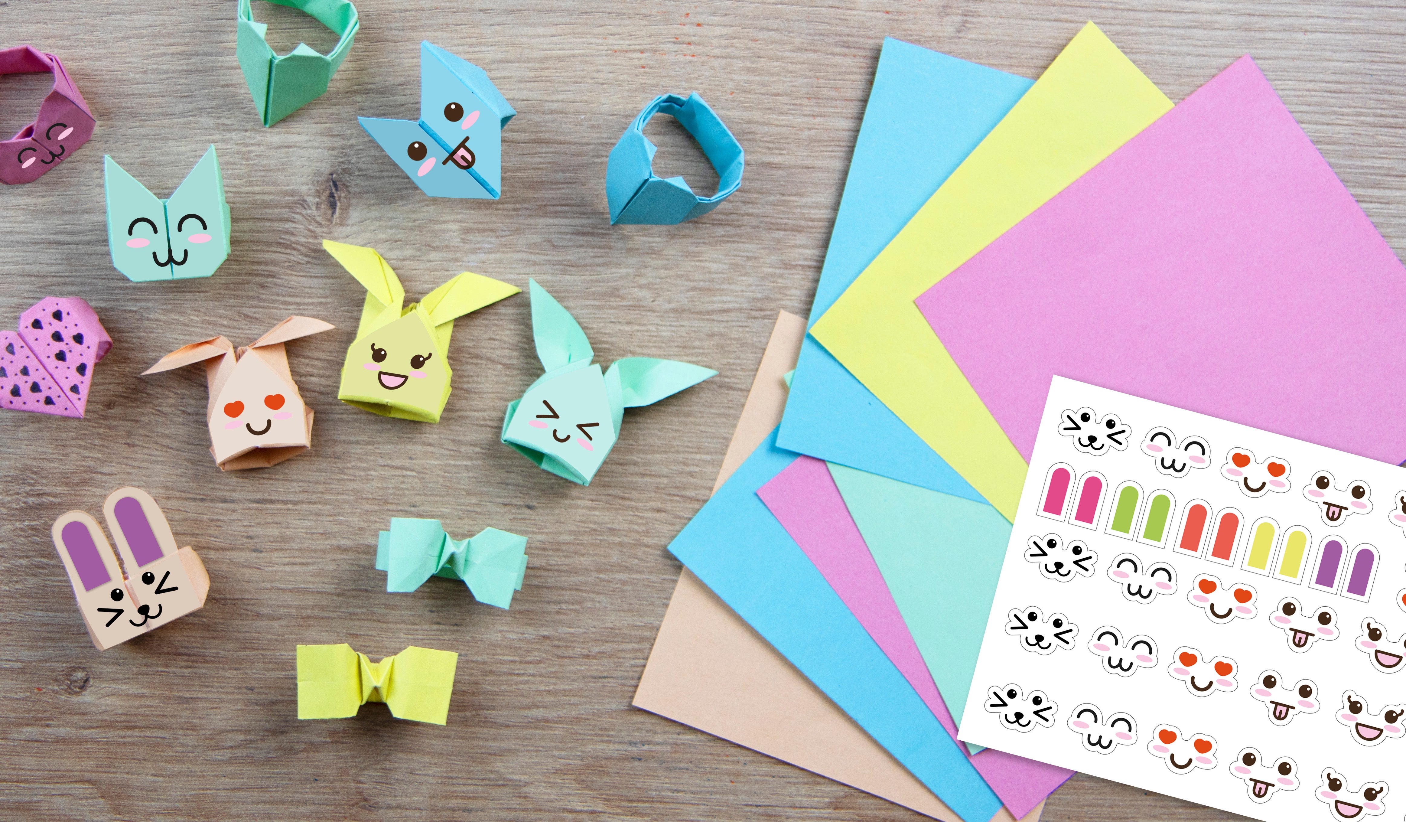 Material: Printed origami-paper sheets in assorted colors + sticker sheet + instruction booklet + storage pouch
